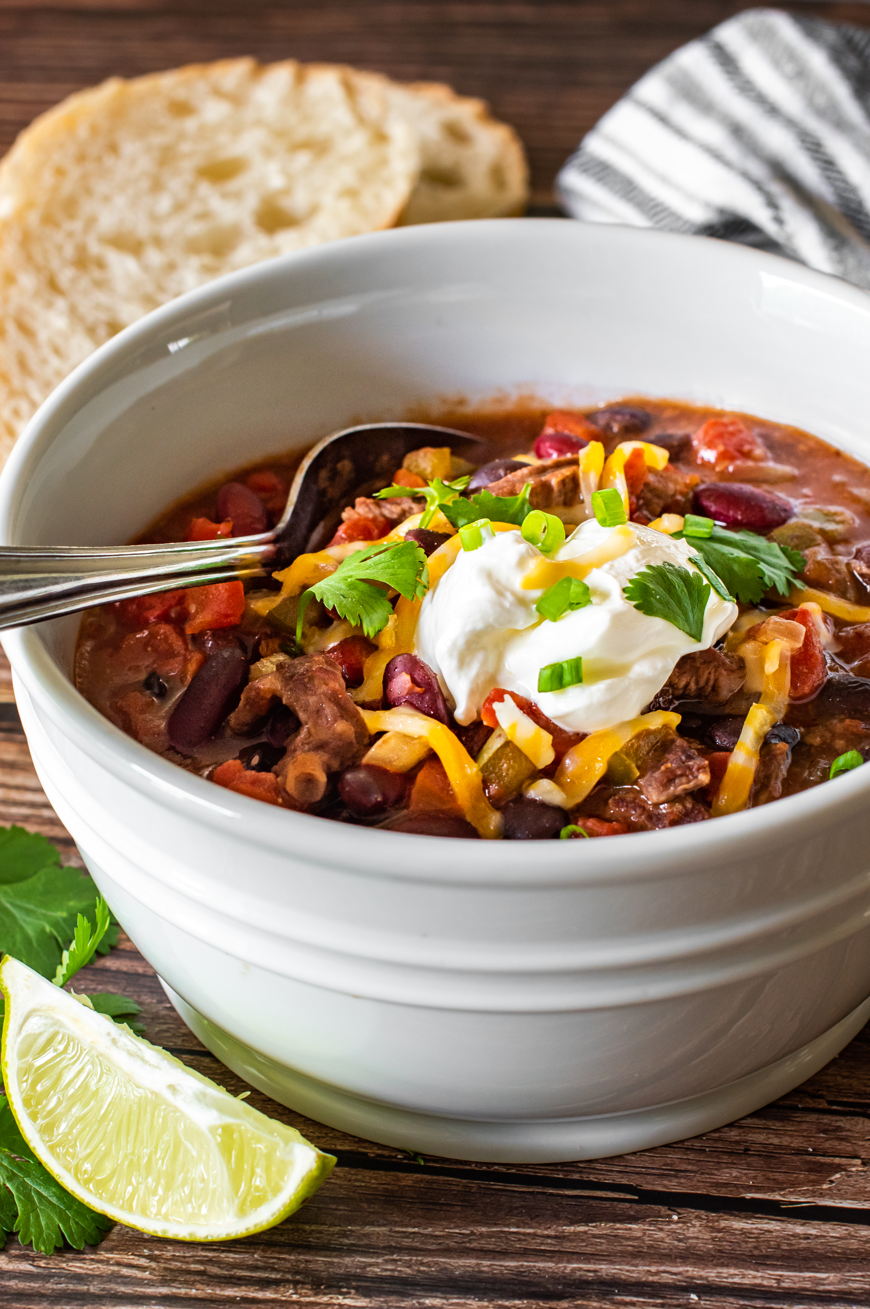 - Ladle chili into bowls with a side of rice or rustic bread and top with sour cream and green onions.